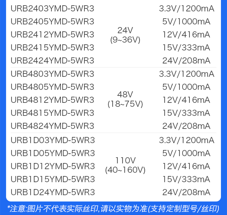 UR(A)B_YMD-5WR3 系列產(chǎn)品輸出功率爲(wèi) 5W,4:1寬電壓輸入範(fàn)圍,效率高達(dá) 90%,1500VDC的常規(guī)隔離電壓,允許工作溫度-40℃to +85℃,具有輸出過(guò)壓、過(guò)流、短路保護(hù)功能,裸機(jī)滿足 CISPR32/EN55032CLASSA,廣泛應(yīng)用於醫(yī)療、工控、電力、儀器儀表、通信、鐵路等領(lǐng)域。