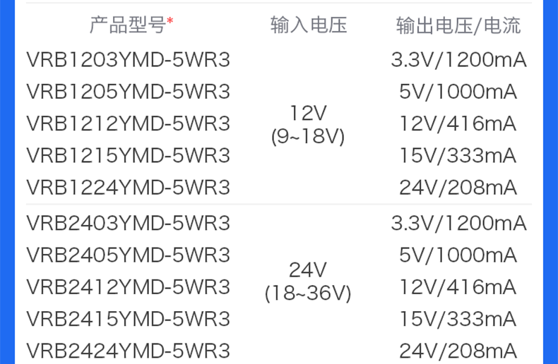 VR(A)B_YMD-5WR3 系列產(chǎn)品輸出功率爲(wèi) 5W,2:1 寬電壓輸入範(fàn)圍,效率高達(dá) 84%,1500VDC的常規(guī)隔離電壓,允許工作溫度-40°Cto+85°℃,具有輸出過壓、過流、短路保護(hù)功能廣泛應(yīng)用於醫(yī)療、工控、電力、儀器儀表、通信、鐵路等領(lǐng)域。