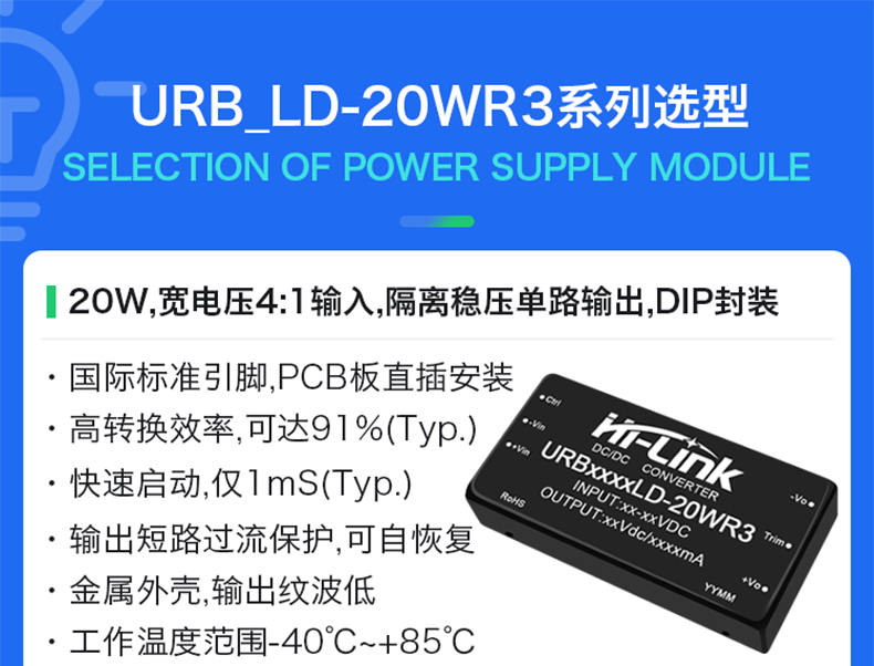 UR(A)B LD-20WR3 系列產品輸出功率爲 20W,4:1寬電壓輸入範圍,效率高達 91%,1500VDC 的常規(guī)隔離電壓,允許工作溫度-40℃to +85℃,具有輸入欠壓保護,輸出過壓、過流、短路保護功能,裸機滿足 CISPR32/EN55032CLASSA,廣泛應用於醫(yī)療、工控、電力、儀器儀表、通信、鐵路等領域。
