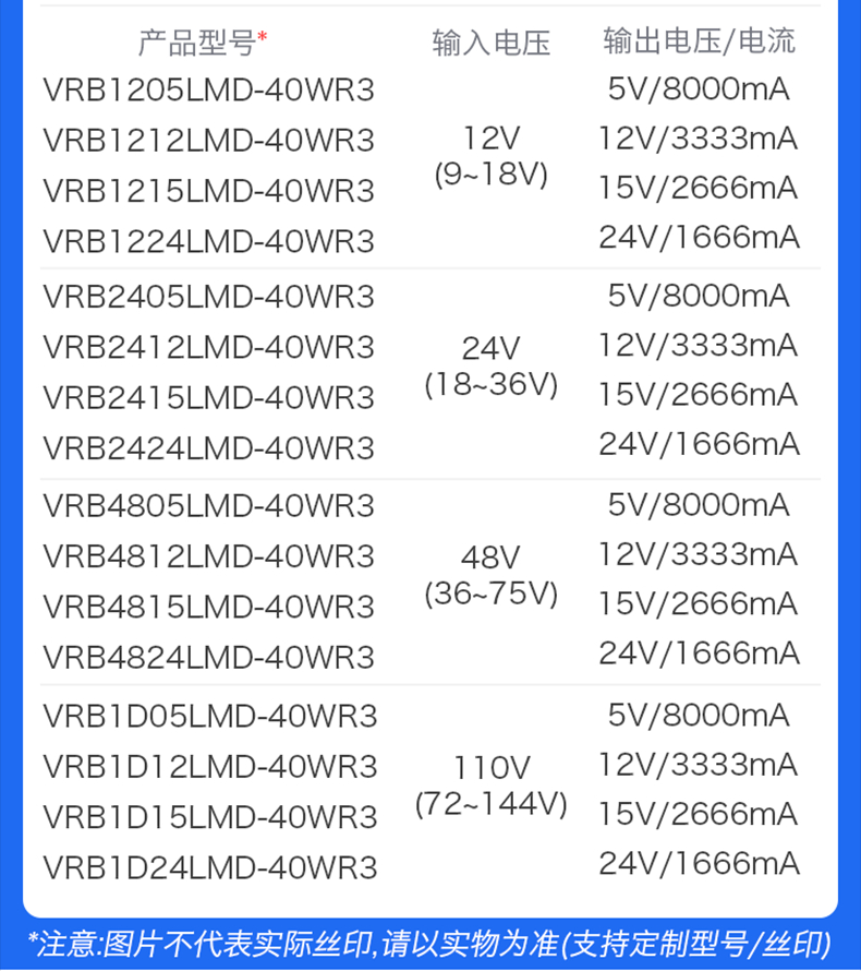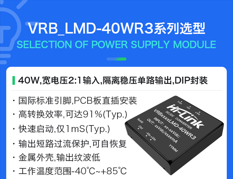 VR(A)B_LMD-40WR3 系列產(chǎn)品輸出功率爲(wèi) 40W,2:1 寬電壓輸入範(fàn)圍,效率高達(dá) 91%,1500VDC 的常規(guī)隔離電壓,允許工作溫度-40℃C to +85℃,具有輸入欠壓保護(hù),輸出過(guò)壓、過(guò)流、短路保護(hù)功能,裸機(jī)滿(mǎn)足 CISPR32/EN55032CLASSA,廣泛應(yīng)用於醫(yī)療、工控、電力、儀器儀表、通信、鐵路等領(lǐng)域。
