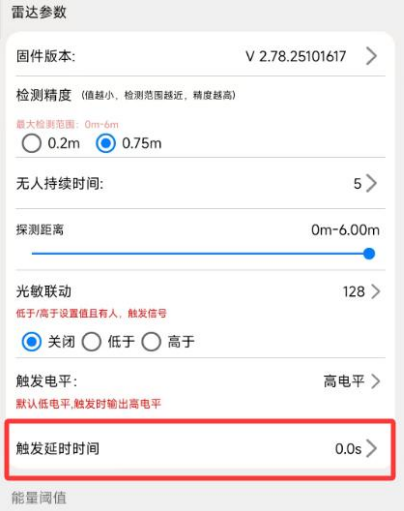 升級(jí)至最新版APP(安卓版本號(hào)≥ V1.6.47)並更新最新固件(V2.78.25101617)後,在“雷達(dá)參數(shù)”設(shè)置頁面中,您可以清晰地找到“觸發(fā)延時(shí)時(shí)間”的設(shè)置選項(xiàng)。