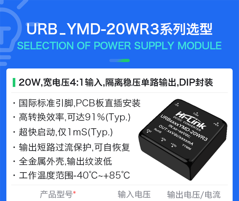 UR(A)B_YMD-20WR3 系列產(chǎn)品輸出功率為 20W,4:1寬電壓輸入范圍,效率高達(dá) 91%,1500VDC 的常規(guī)隔離電壓,允許工作溫度-40Cto +85℃,具有輸入欠壓保護(hù),輸出過壓、過流、短路保護(hù)功能,裸機(jī)滿足 CISPR32/EN55032CLASSA,廣泛應(yīng)用于醫(yī)療工控、電力、儀器儀表、通信、鐵路等領(lǐng)域。