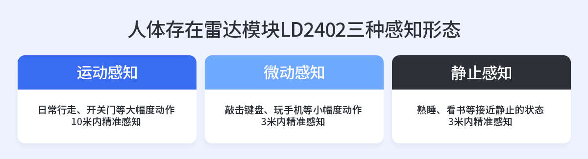 答:LD2402和LD2410B兩款24G雷達模塊,均支持感知人體靜止、微動、運動等狀態(tài)下的人體存在。