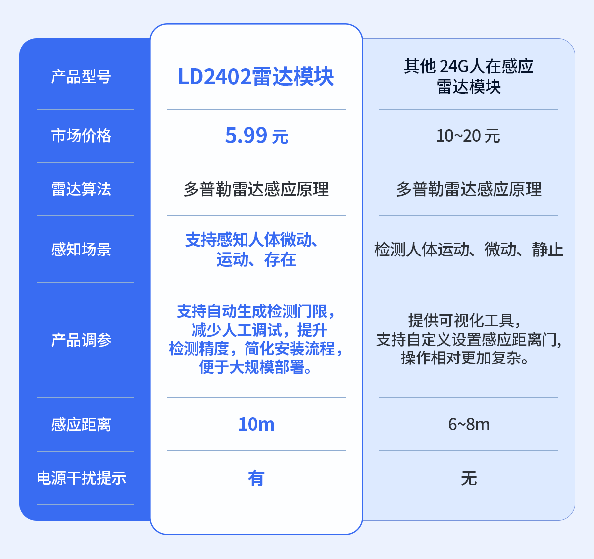 LD2402單價僅為5.9元,僅為市場上類型的產(chǎn)品價格的1/3左右,同時LD2402性能上全方位提升,感應距離可達10m,新增了自動生成門限和電池干擾提示功能,不管是價格、性能還是使用體驗上LD2402都更具優(yōu)勢。